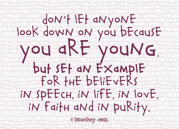 1 Timothy 4:12 - Don't let anyone look down on you because you are young, but set an example for the believers in speech, in life, in love, in faith and in purity.