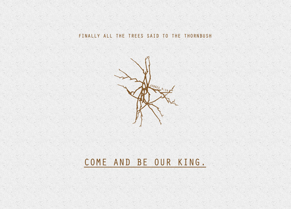 Finally all the trees said to the thornbush, ‘Come and be our king.’
