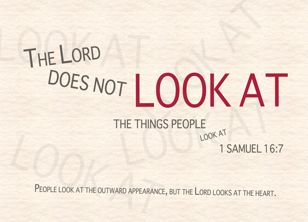 But the Lord said to Samuel, “Do not consider his appearance or his height, for I have rejected him. The Lord does not look at the things people look at. People look at the outward appearance, but the Lord looks at the heart.”