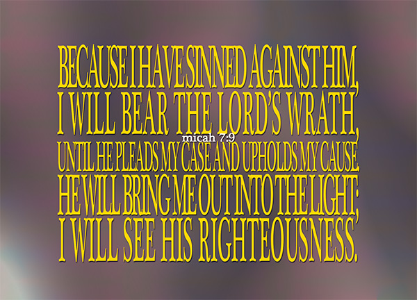 Because I have sinned against him, I will bear the Lord’s wrath, until he pleads my case and upholds my cause. He will bring me out into the light; I will see his righteousness.
