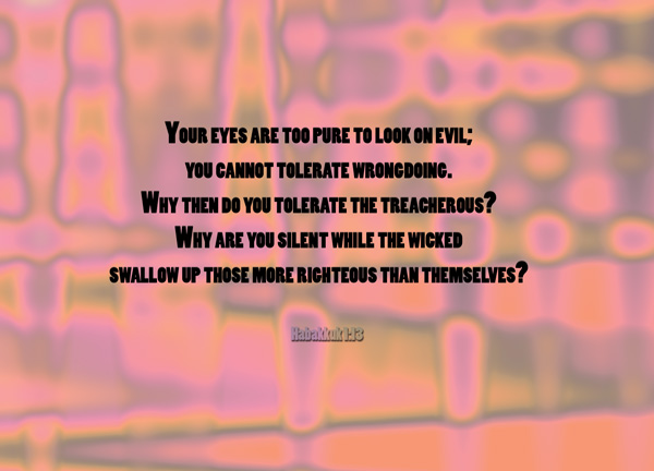 Habakkuk 1:13 - Your eyes are too pure to look on evil; you cannot tolerate wrongdoing. Why then do you tolerate the treacherous? Why are you silent while the wicked swallow up those more righteous than themselves?