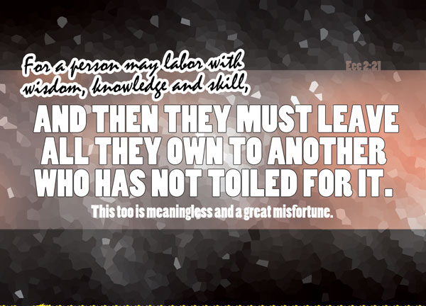 For a man may do his work with wisdom, knowledge and skill – a random man was used in Solomon’s analogy, and the analogy given was an ideal one – a diligent man, perhaps, who labored in the right ways, applying what he knew and what he had to achieve many things in life. Perhaps he gained a great many things. Perhaps he achieved all his life goals. In the eyes of the world many of us would be envious and would certainly call this a very good and fulfilled life.