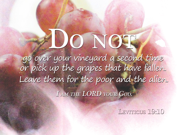 Do not go over your vineyard a second time or pick up the grapes that have fallen. Leave them for the poor and the alien. I am the LORD your God.